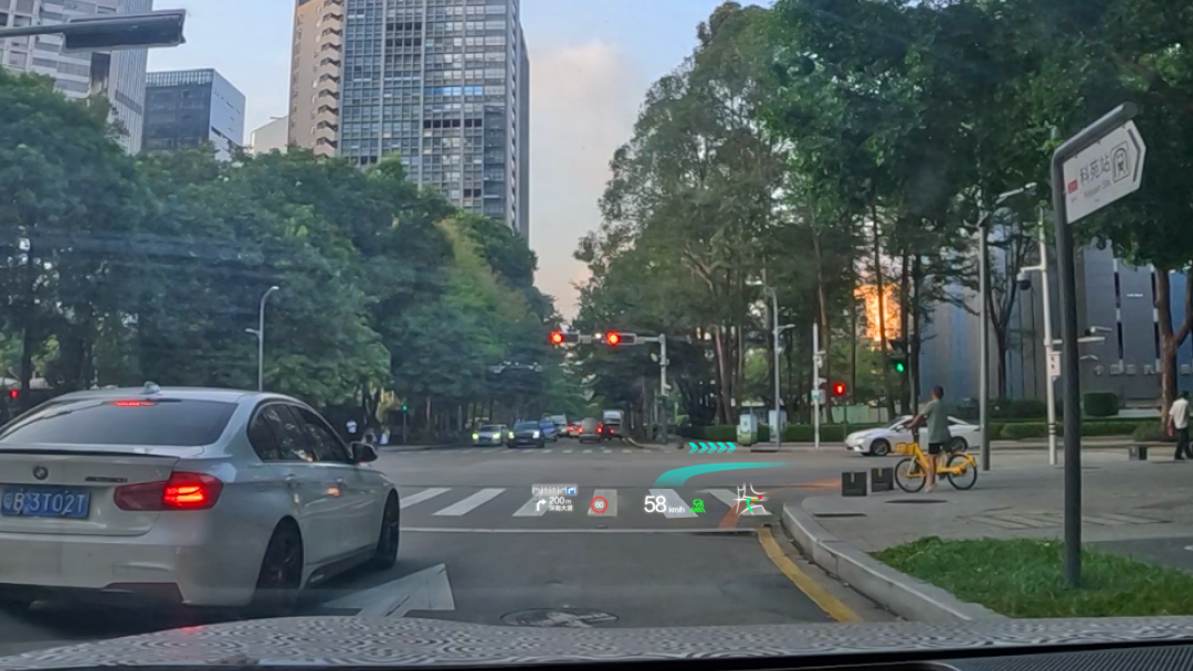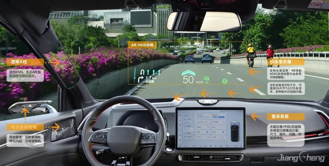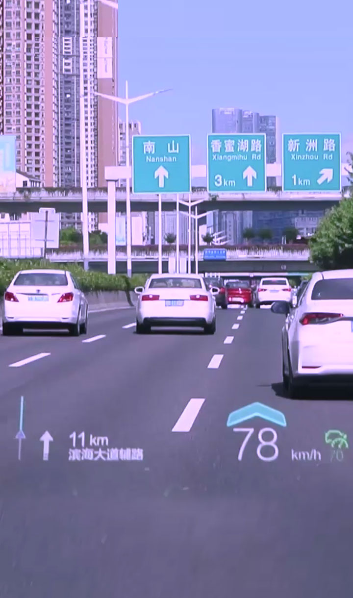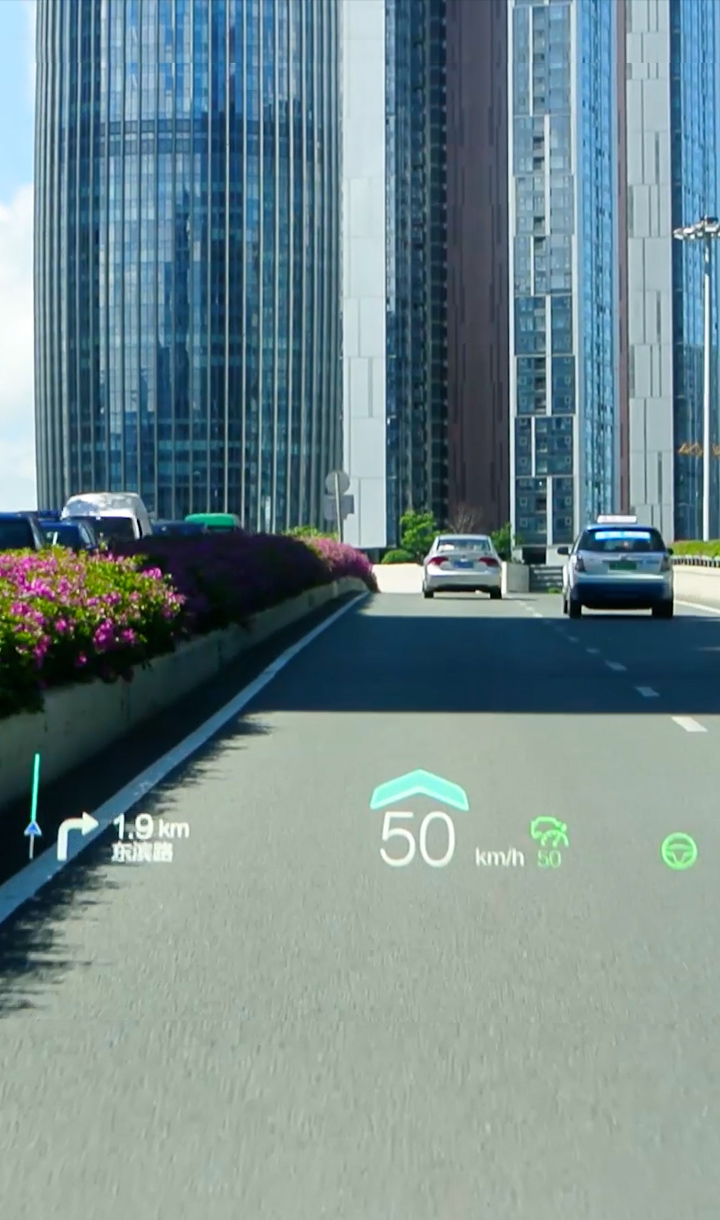 基于復(fù)雜變量環(huán)境完成大尺寸、小體積的光機(jī)設(shè)計(jì),并采用多數(shù)據(jù)融合算法實(shí)現(xiàn)導(dǎo)航、ADAS等輔助駕駛信息在真實(shí)路況上的疊加、融合顯示,提升駕駛安全性的同時給予更酷炫、更智能的駕駛體驗(yàn)。