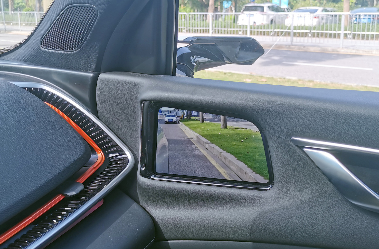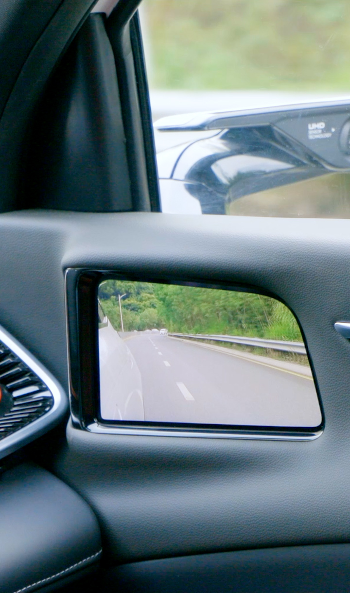 車規(guī)級OLED柔性屏貼合A柱設(shè)計(jì),通過算法實(shí)現(xiàn)A柱“透明化、可視化”,不影響造型美觀與A柱強(qiáng)度情況下,完美解決A柱盲區(qū)問題。